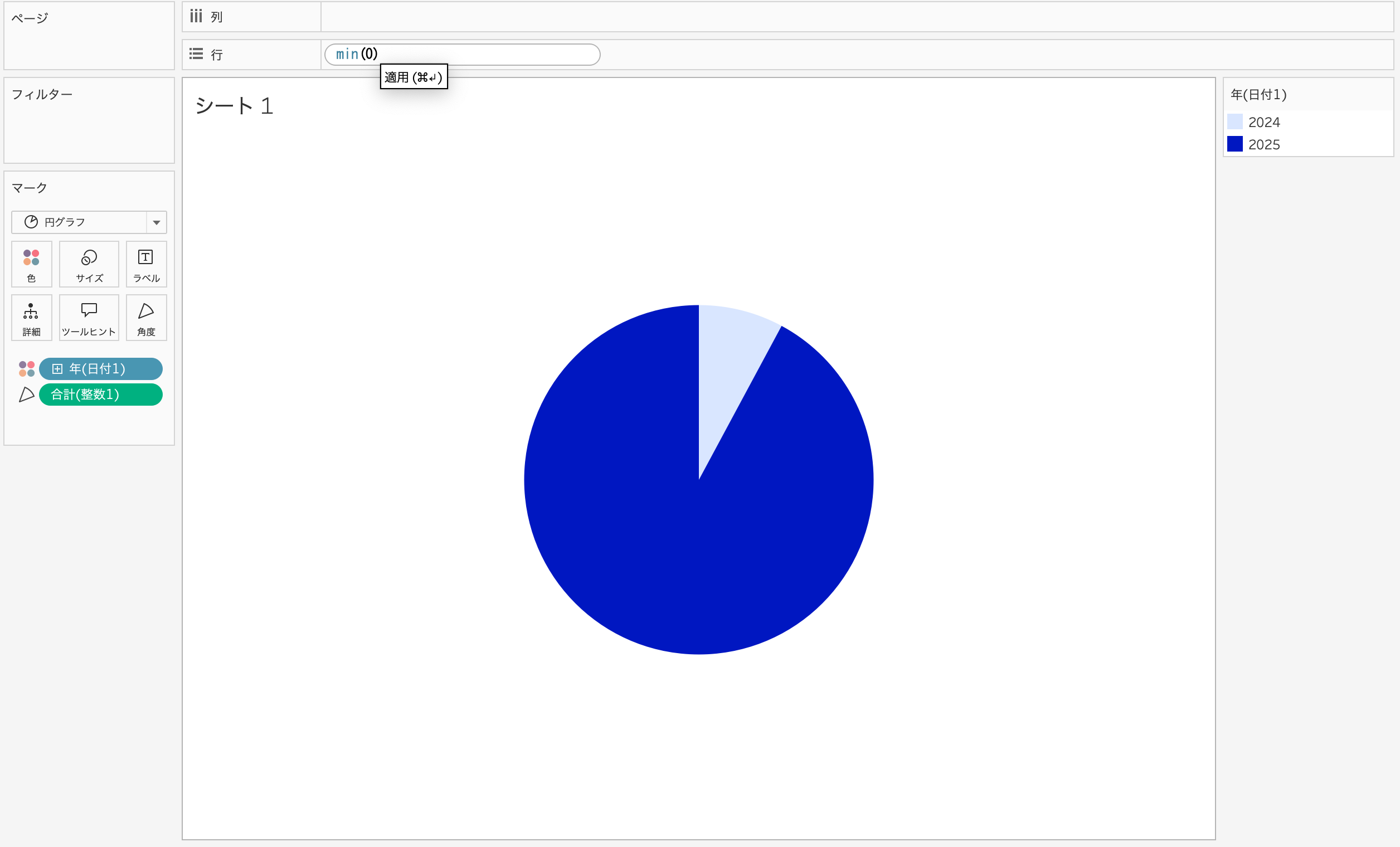 円グラフが描画できている状態で,行シェルフで右クリックをすることで新しい計算式を入れる。