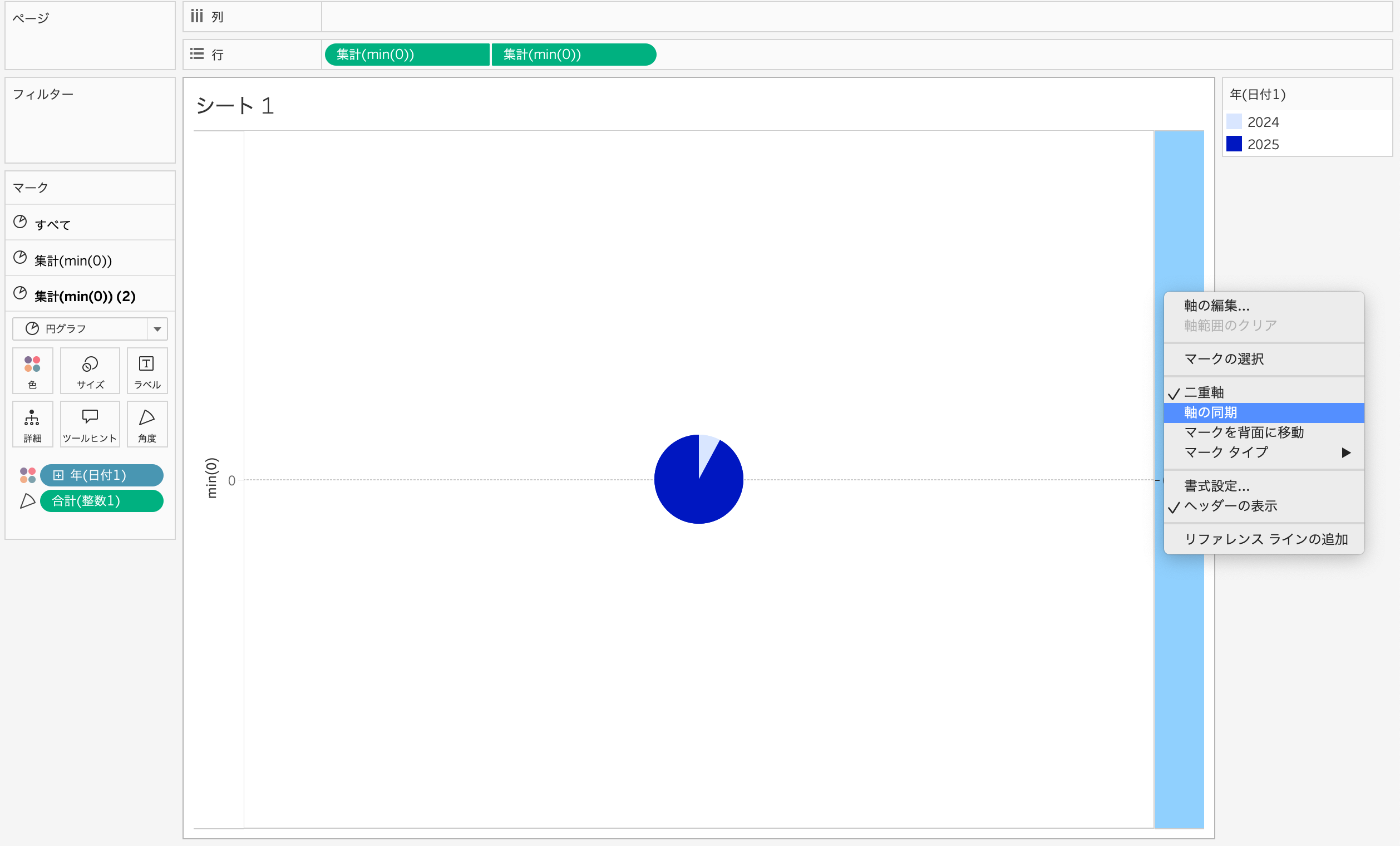 複製したフィールドを右クリックすることで,「二重軸」に変更する。